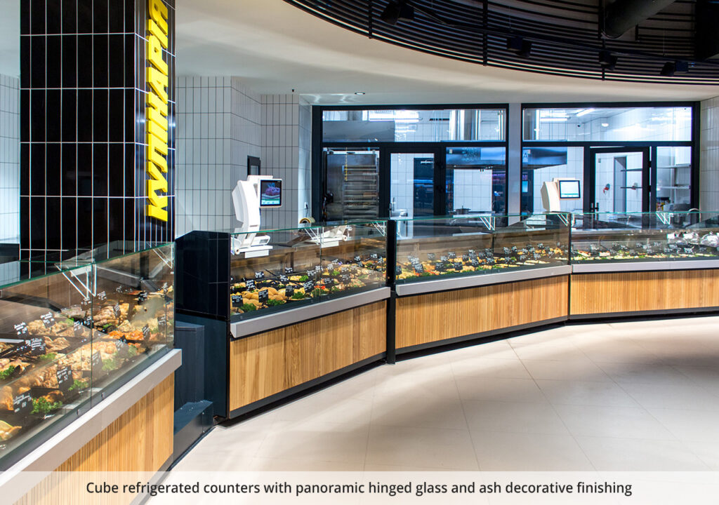 Each shopping area of the store has a total area of 2850 sq.m. is framed in its thematic design, which makes the project as a whole unique and dynamic. The diversity of the product range is highlighted with interior details and equipment modifications and finishes. For each shopping area, Aisberg specialists have made an individual line of displays for designer finishes from natural materials – wood, glass, ceramics. Ultramarket is an example of effective combination of Diagonal and Cube display in a single retail space.
