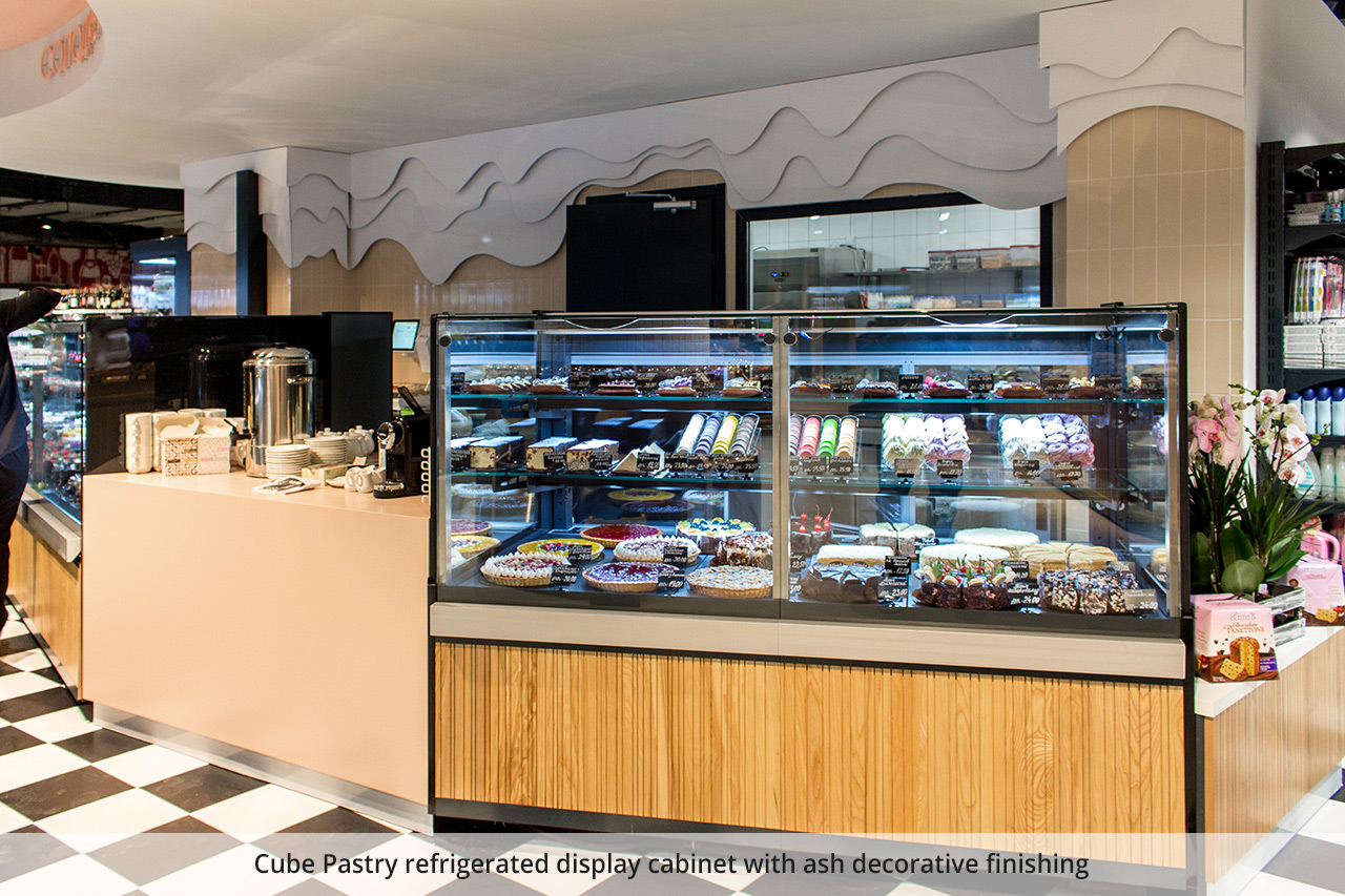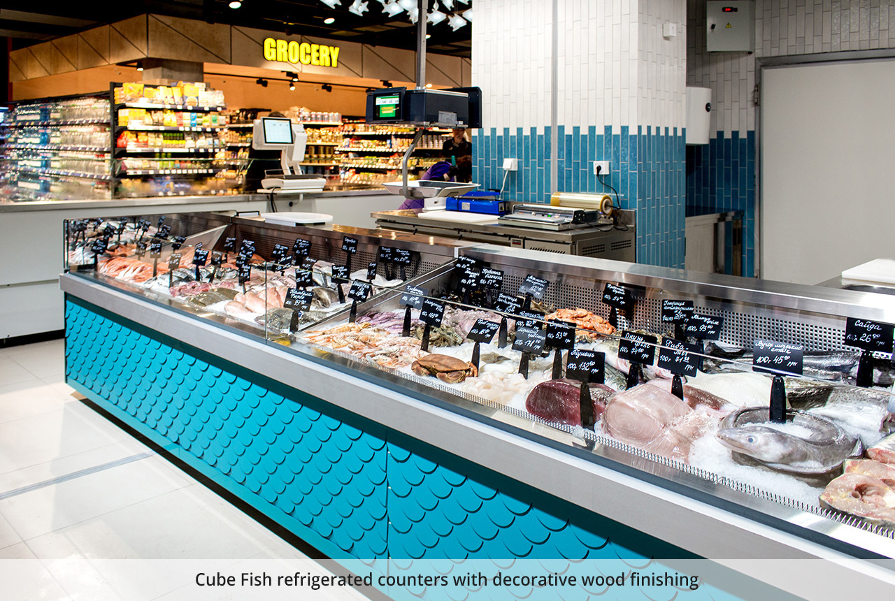 Each shopping area of the store has a total area of 2850 sq.m. is framed in its thematic design, which makes the project as a whole unique and dynamic. The diversity of the product range is highlighted with interior details and equipment modifications and finishes. For each shopping area, Aisberg specialists have made an individual line of displays for designer finishes from natural materials – wood, glass, ceramics. Ultramarket is an example of effective combination of Diagonal and Cube display in a single retail space.