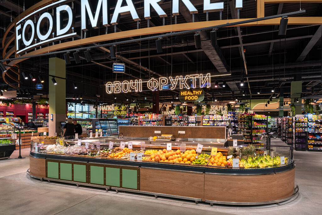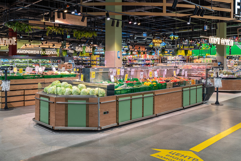 На торгівельній площі 2900 кв.м розташовано три зони продажу – фруктів, овочів та делікатесів – з холодильними прилавками Cube в острівній комбінації. Всі прилавки мають модифікацію self-servise для максимально вільного вибору продуктів самими покупцями.