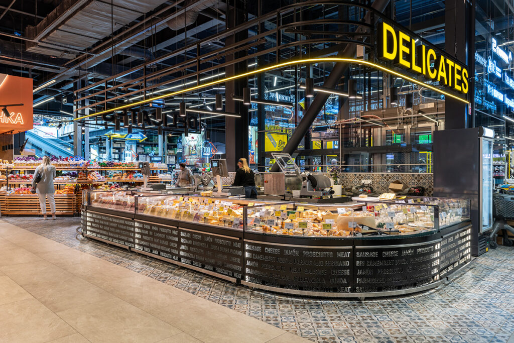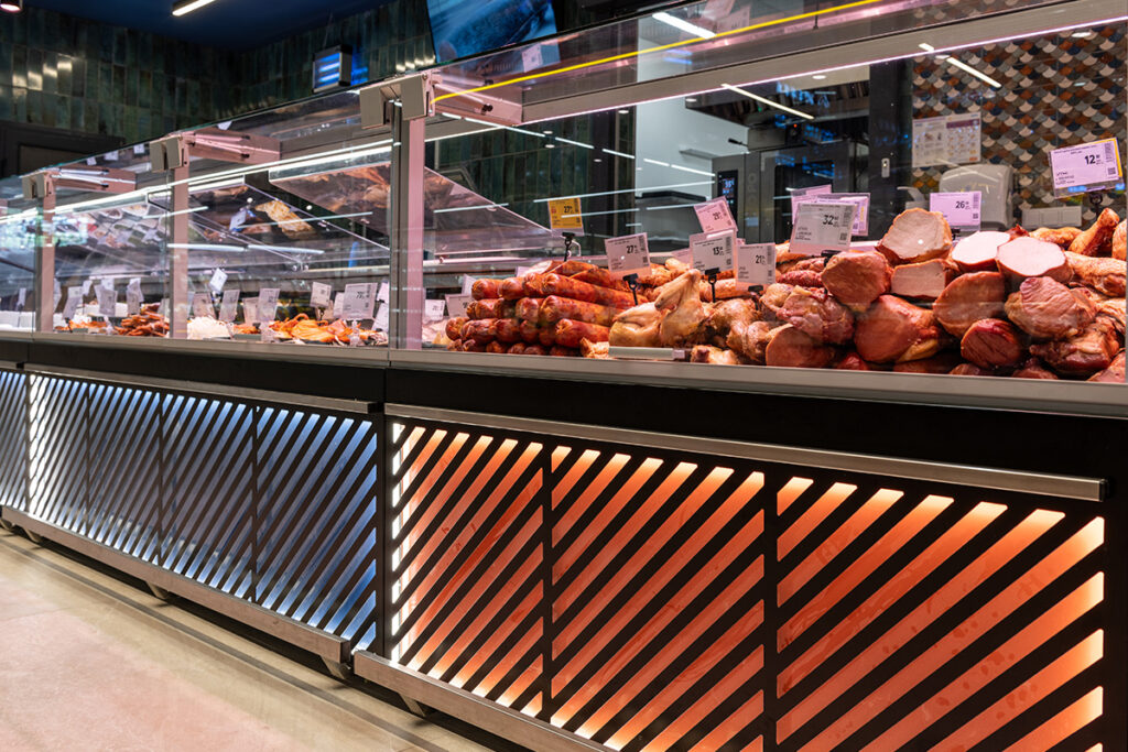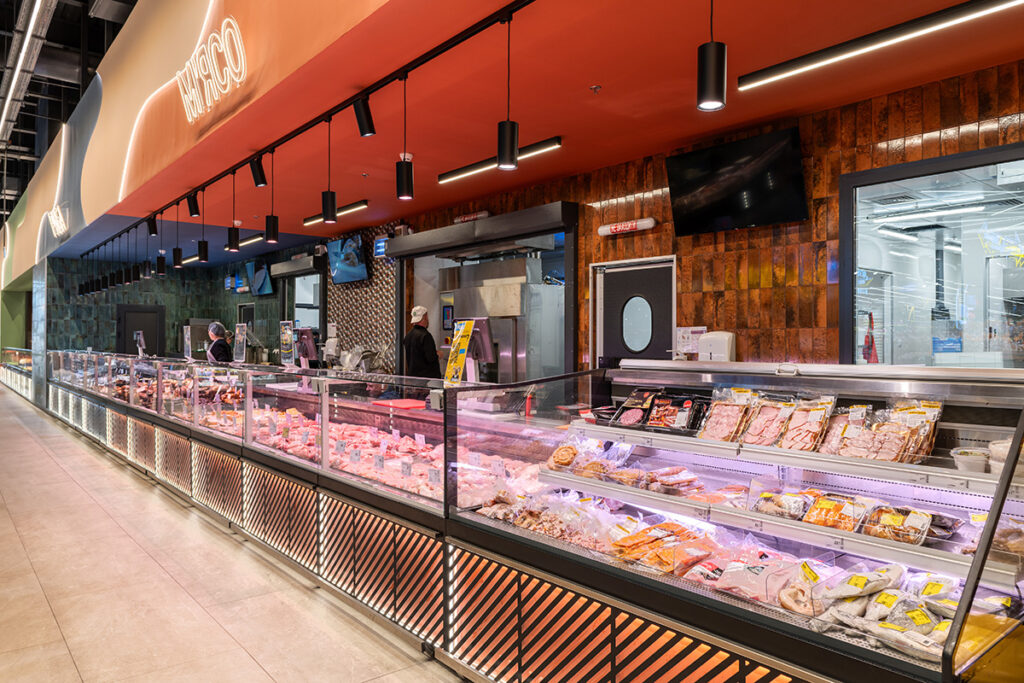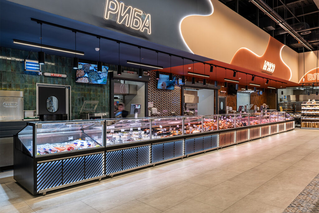 Велика лінія холодильних вітрин довжиною 13м, де кожен модуль спеціалізований для продажу окремих сортів риби та особливих видів м’ясних продуктів, привертає увагу покупців яскравим декором. Рибний та м’ясний відділи підкреслено кольором обробки. Для кожного продукта – свій холодильних модуль з особливою конструкцією та температурним режимом – для збереження якості продуктів та їх ефективного експонування.