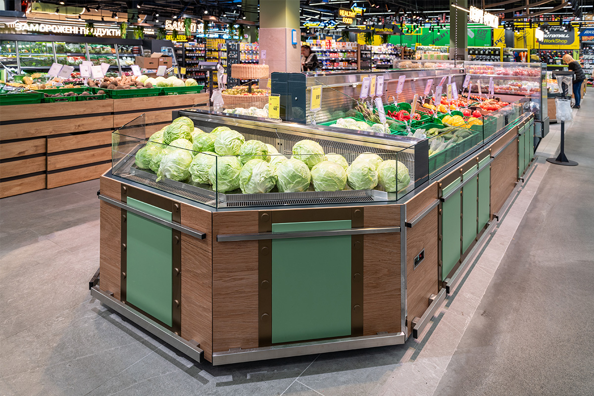 На торгівельній площі 2900 кв.м розташовано три зони продажу – фруктів, овочів та делікатесів – з холодильними прилавками Cube в острівній комбінації. Всі прилавки мають модифікацію self-servise для максимально вільного вибору продуктів самими покупцями.