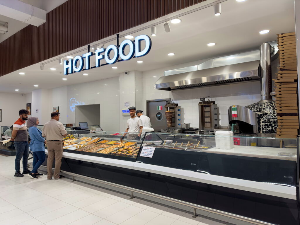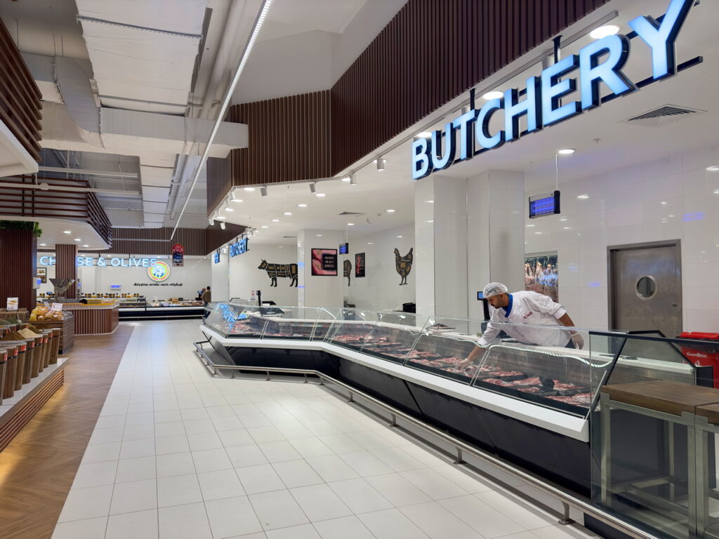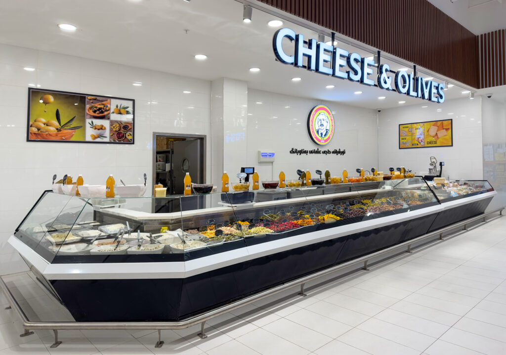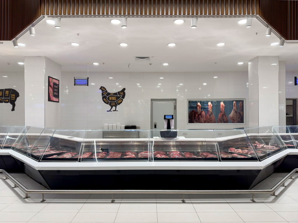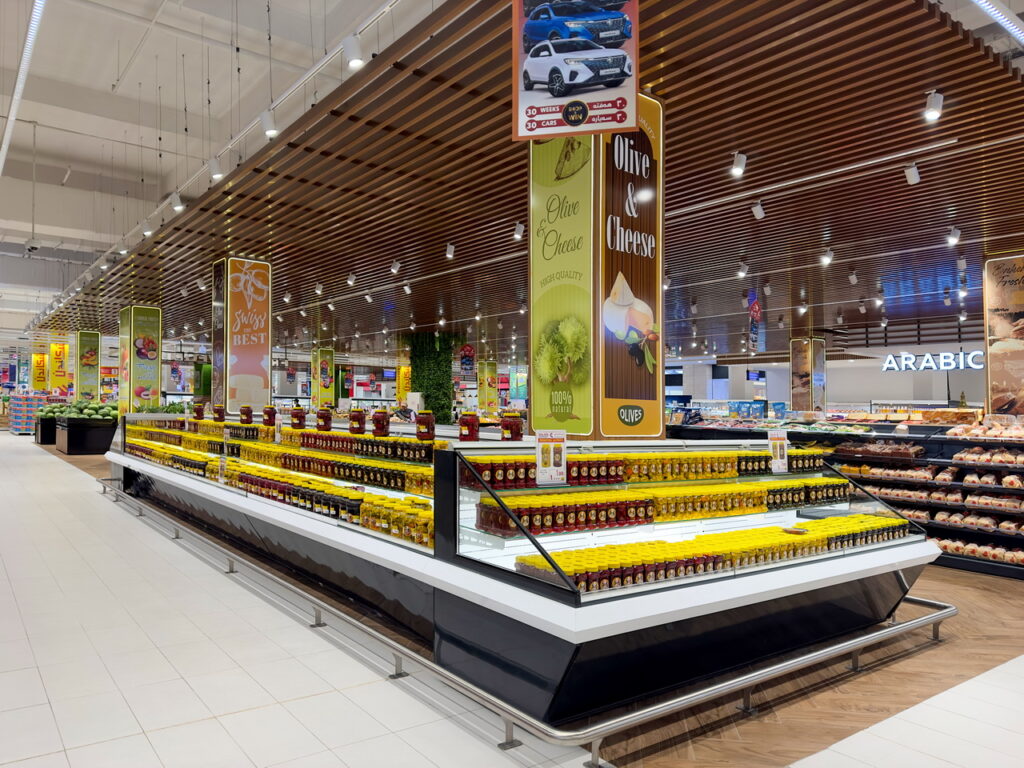 Спеціалізовані модифікації обладнання в дизайні Diagonal з нахиленими експозиційними поверхнями використано для продажу гарячої кулінарії, риби на льоду, олив та м’яса.