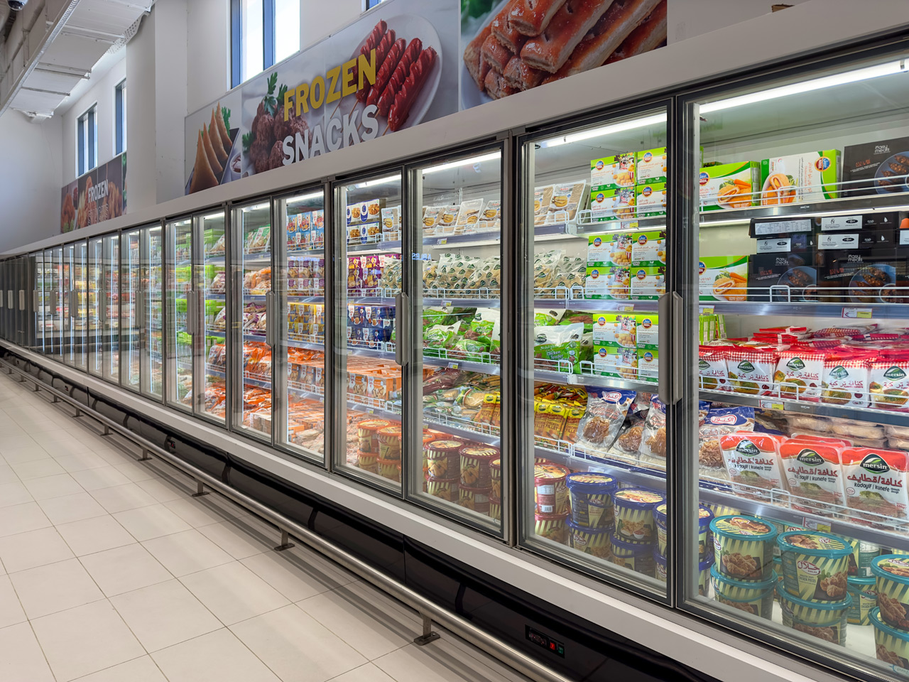 Спеціалізовані модифікації обладнання в дизайні Diagonal з нахиленими експозиційними поверхнями використано для продажу гарячої кулінарії, риби на льоду, олив та м’яса.