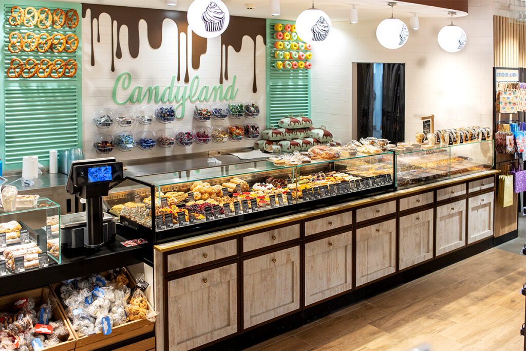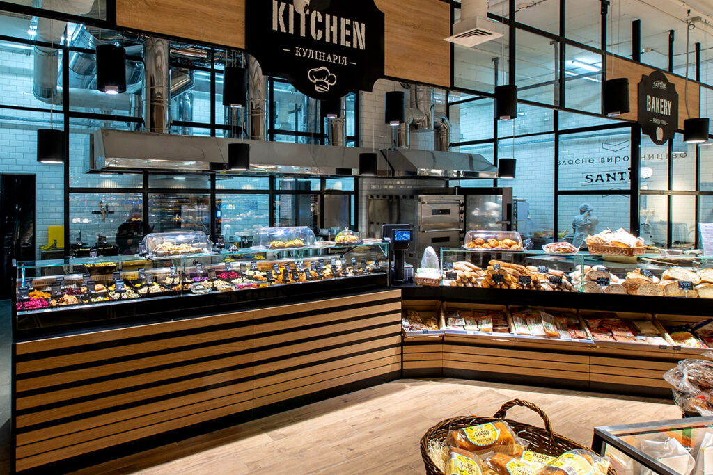 Для кондитерського та кулінарного відділів нового Santim інженери Aisberg реконструювали серійні вітрини Cube SO на вузькому корпусі Slim з внутрішньою холодильною камерою. Значно піднятий рівень експозиційної поверхні. Встановлено панорамне скло без кроншейнів та стійок. Ці конструкторські рішення забезпечують максимальну зручність вибору кондитерських делікатесів та кулінарних страв.