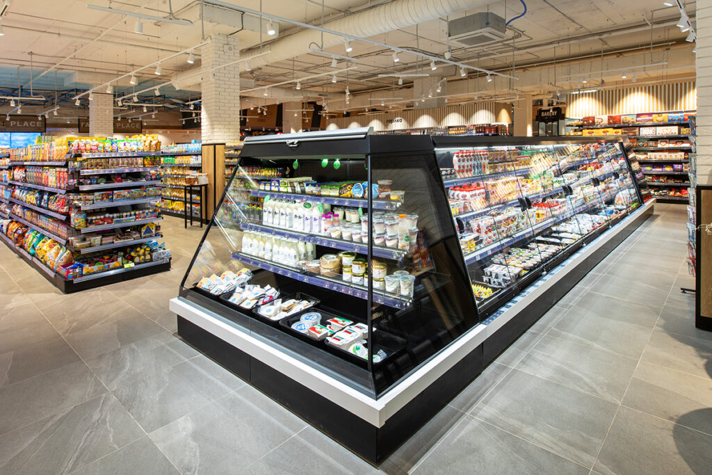 Периметром торгового залу розміщено енергозберігаючі холодильні вітрини Medusa з подвійною повітряною завісою для продажу охолоджених напоїв, ковбас, пресервів та фасованого м’яса.
