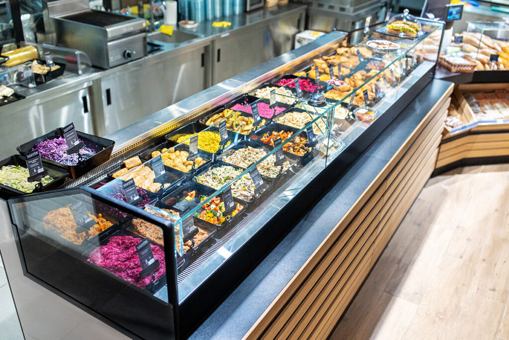 Експозиційний центр супермаркету – лінія холодильних вітрин на компактному корпусі Slim для продажу делікатесної гастрономії. Гастрономічні вітрини Cube S конструктивно поєднані зі спеціалізованими вітринами Cube Meat для продажу м’яса. Усі вітрини мають спеціальну конструкцію для кріплення елементів декоративного оздоблення. У відділі продажу риби встановлені холодильні вітрини Fish з герметичними ємностями з нержавіючої сталі та дизайнерським облицюванням.