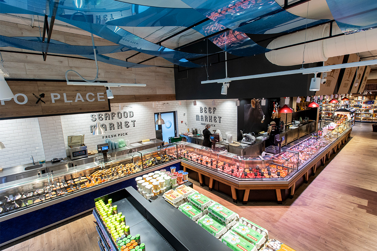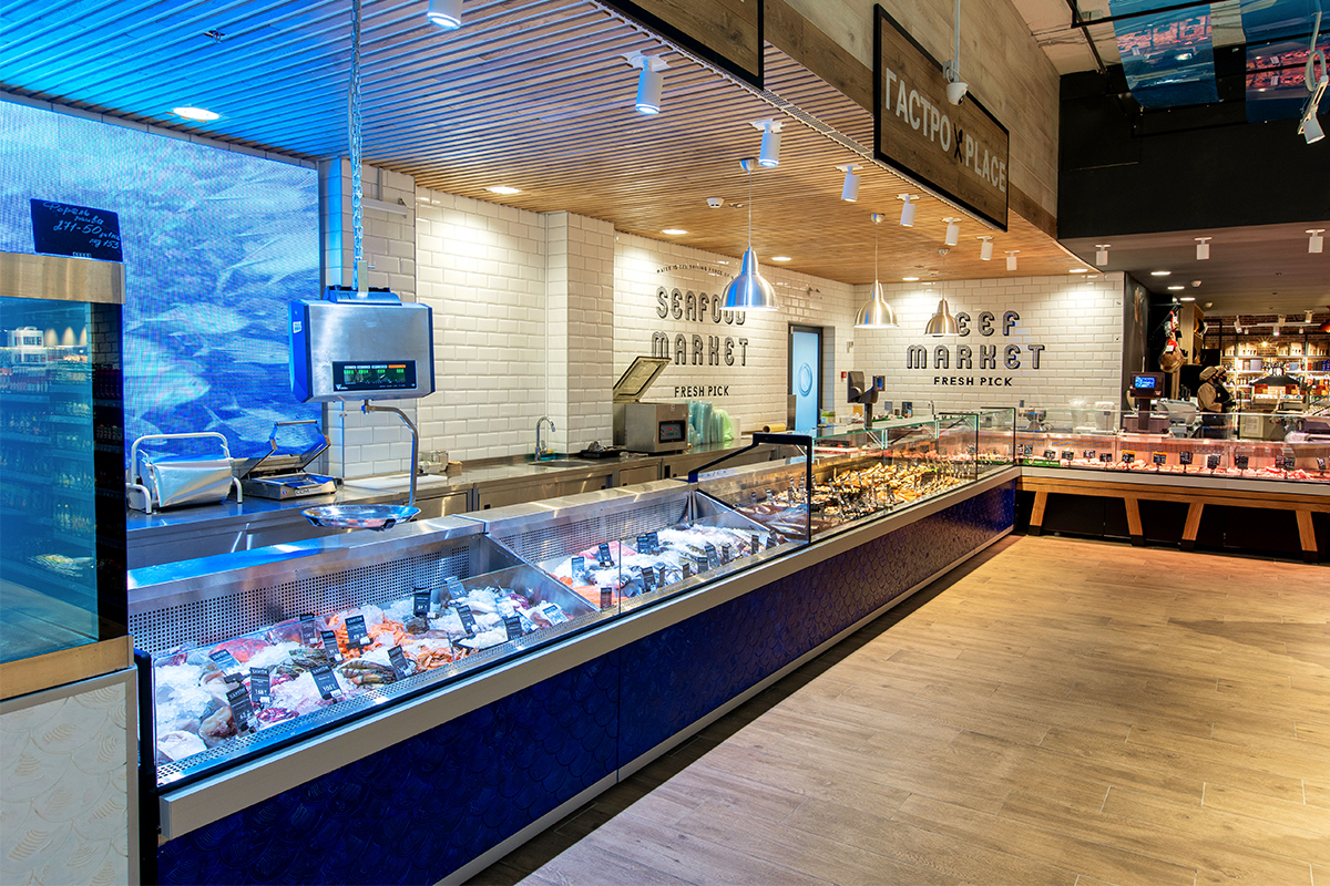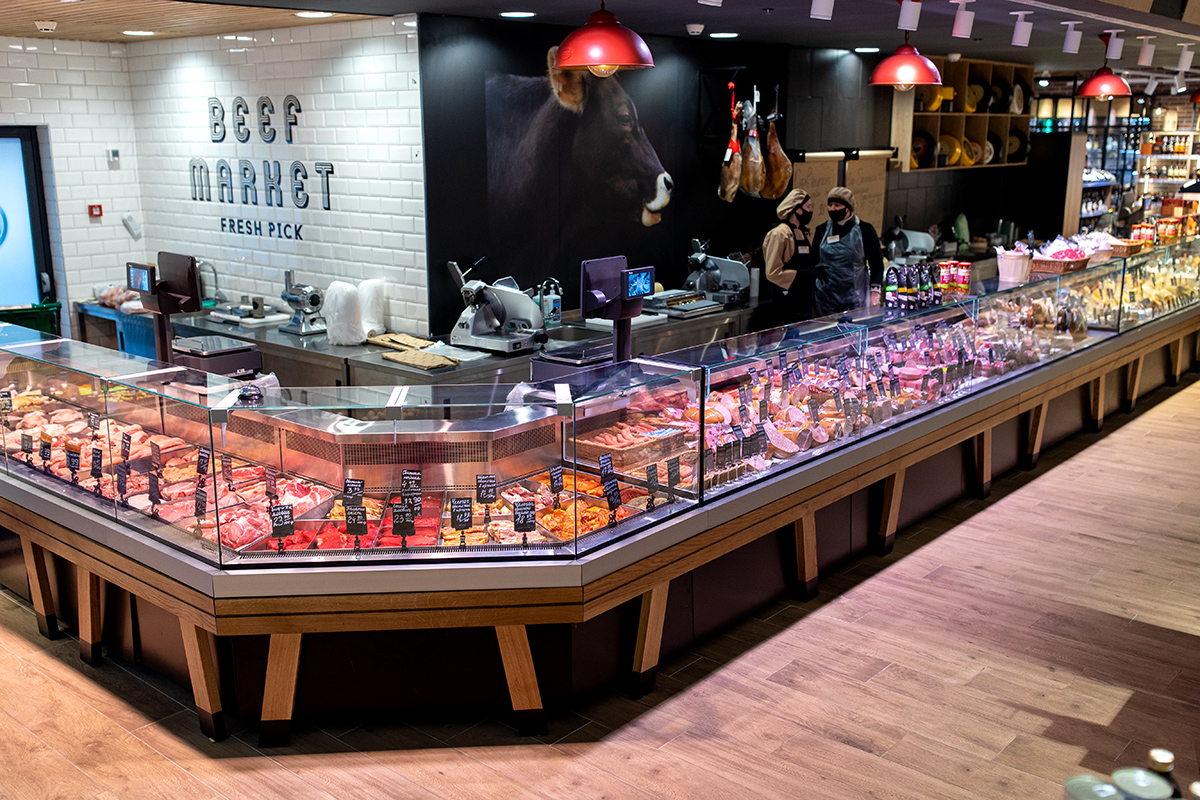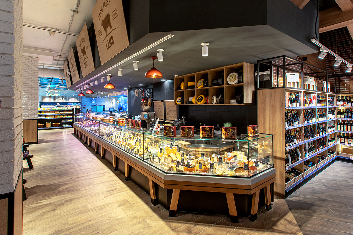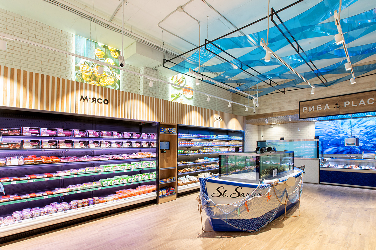 Експозиційний центр супермаркету – лінія холодильних вітрин на компактному корпусі Slim для продажу делікатесної гастрономії. Гастрономічні вітрини Cube S конструктивно поєднані зі спеціалізованими вітринами Cube Meat для продажу м’яса. Усі вітрини мають спеціальну конструкцію для кріплення елементів декоративного оздоблення. У відділі продажу риби встановлені холодильні вітрини Fish з герметичними ємностями з нержавіючої сталі та дизайнерським облицюванням.