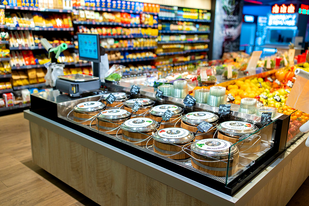 Свіжа зелень, сезонні овочі та фрукти, соління та маринади пропонуються покупцям у компактному острові холодильних вітрин Cube з обробкою з нержавіючої сталі та натурального дерева. Для продажу солінь розроблений спеціалізований холодильний модуль самообслуговування з круглими ємностями-діжками, що охолоджуються. Експозиційна поверхня цієї вітрини має каскадну конструкцію для зручності покупців.