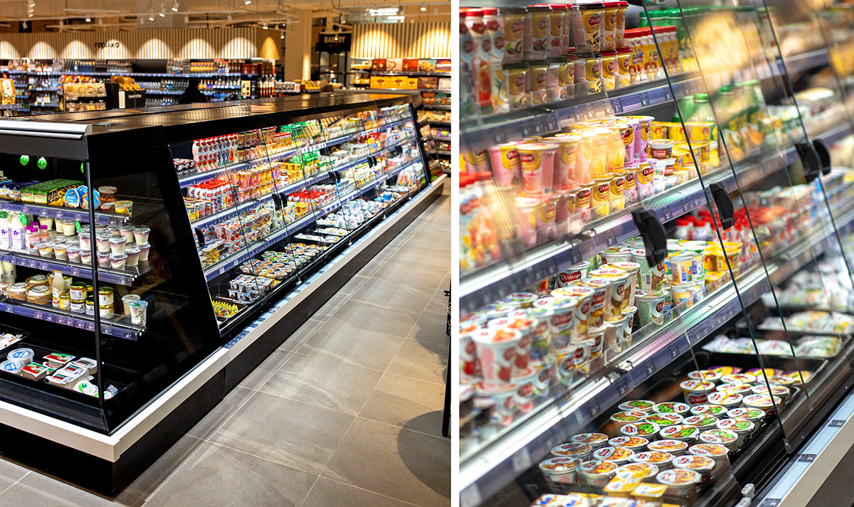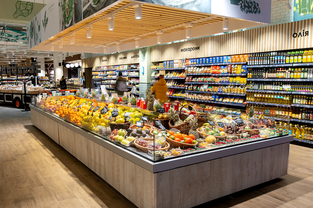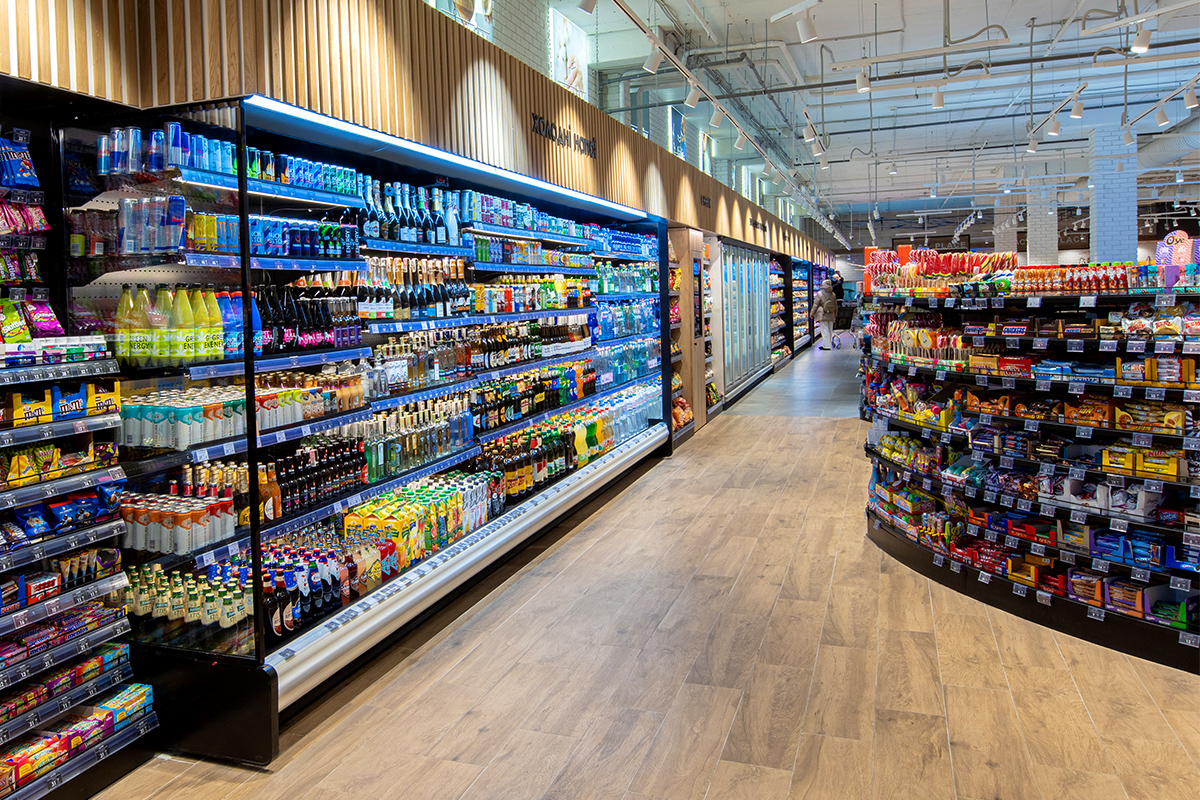 Периметром торгового залу розміщено енергозберігаючі холодильні вітрини Medusa з подвійною повітряною завісою для продажу охолоджених напоїв, ковбас, пресервів та фасованого м’яса.