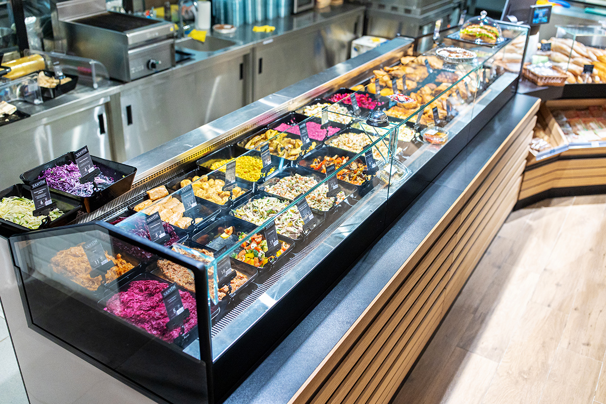Для кондитерського та кулінарного відділів нового Santim інженери Aisberg реконструювали серійні вітрини Cube SO на вузькому корпусі Slim з внутрішньою холодильною камерою. Значно піднятий рівень експозиційної поверхні. Встановлено панорамне скло без кроншейнів та стійок. Ці конструкторські рішення забезпечують максимальну зручність вибору кондитерських делікатесів та кулінарних страв.