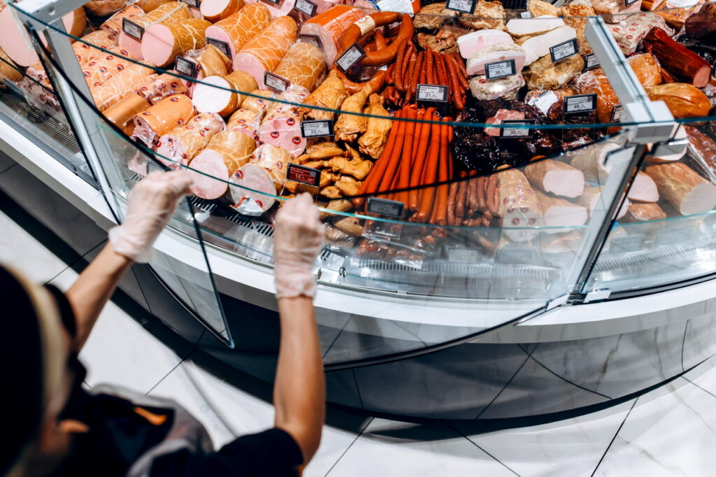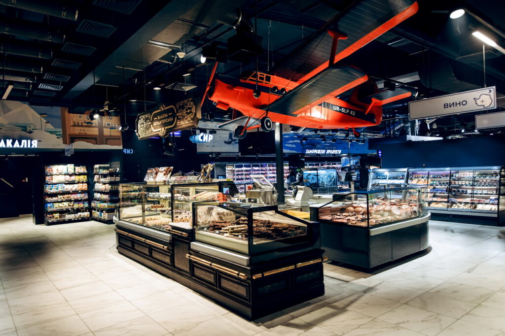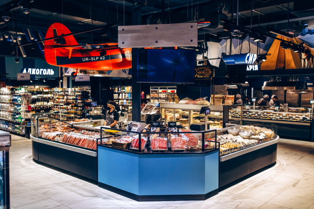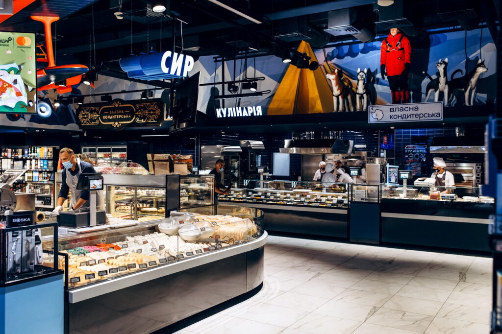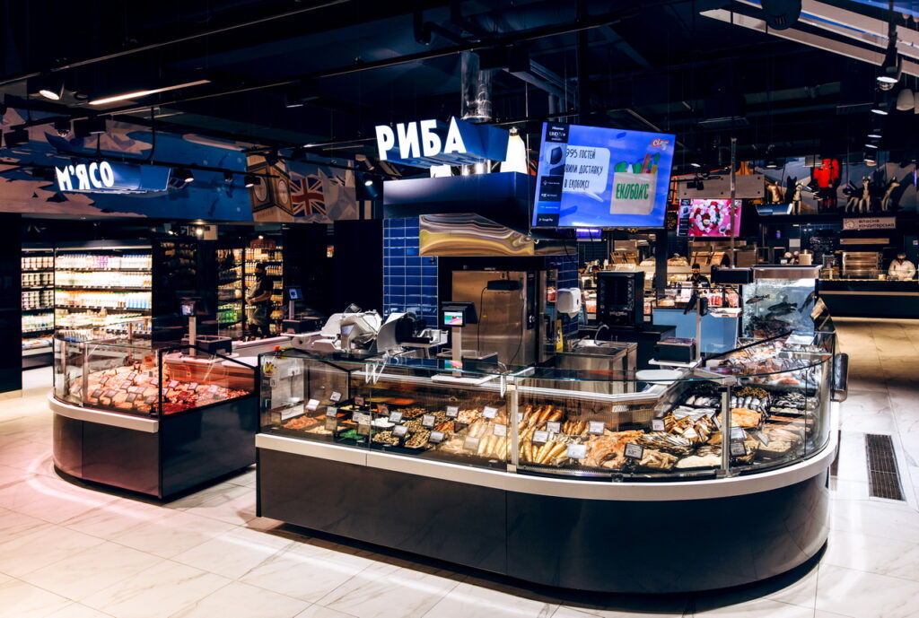 Модифікація холодильних вітрин Cube S зі сферичними кутовими елементами використана для формування острівних зон продажу риби, свіжого м’яса та гастрономії.