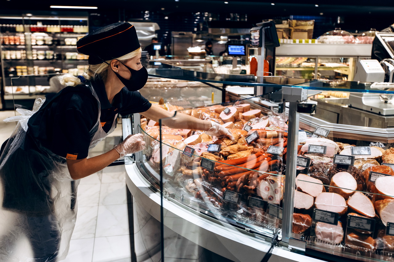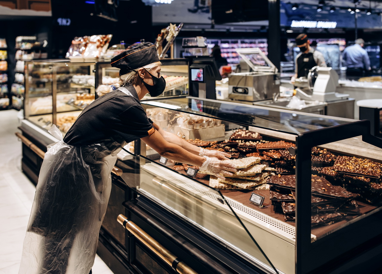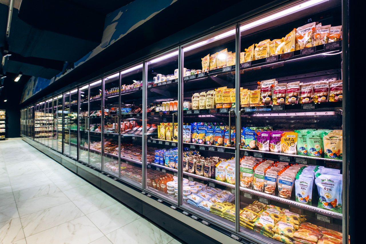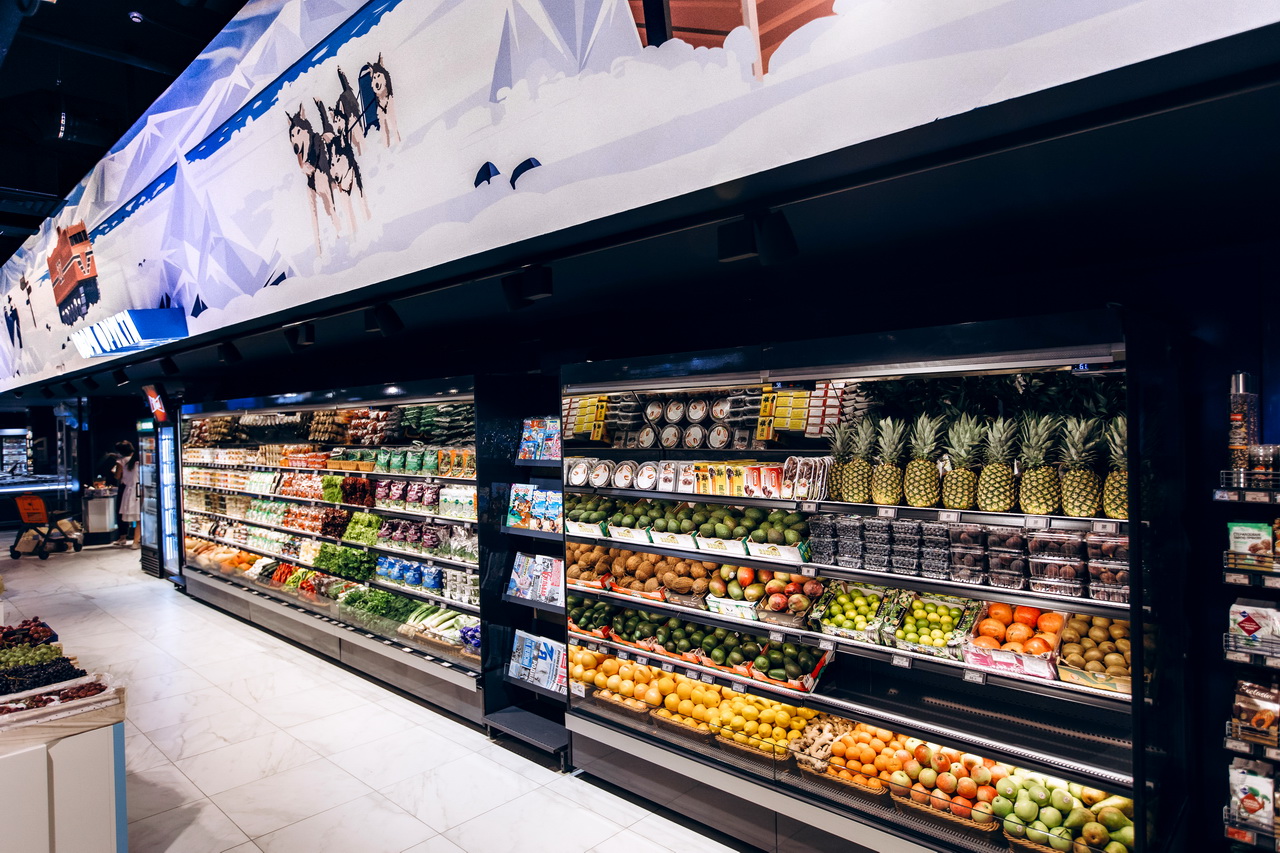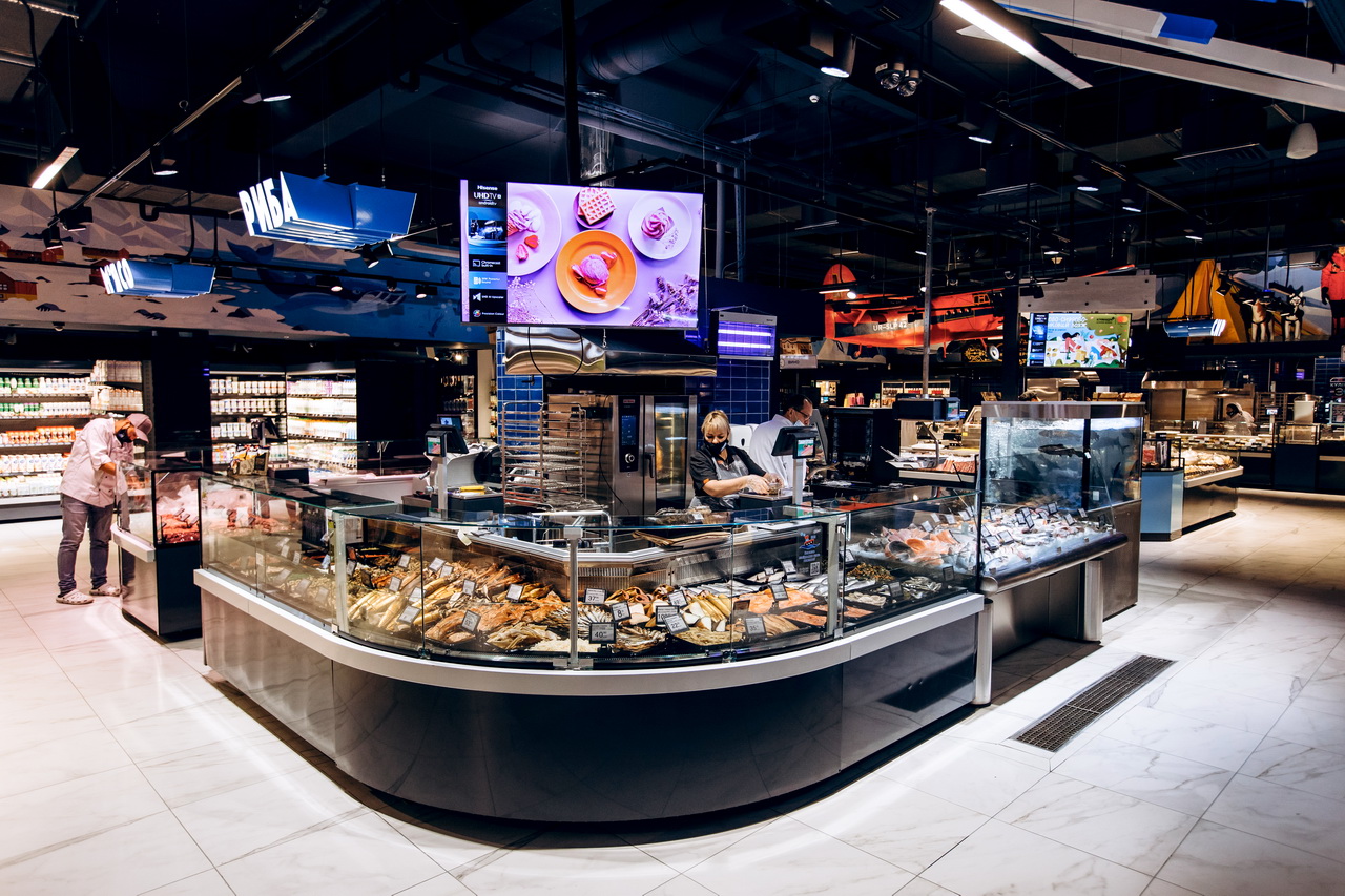 Модифікація холодильних вітрин Cube S зі сферичними кутовими елементами використана для формування острівних зон продажу риби, свіжого м’яса та гастрономії.