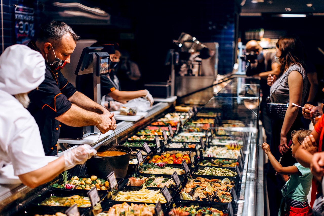 Лінія вітрин для продажу готових страв оснащена холодильними прилавками Cube S з трьома рівнями експозиції з нержавіючої сталі та гарячою вітриною Cube TC з нахиленою до покупця поверхнею з температурним режимом +30/+60 °С.