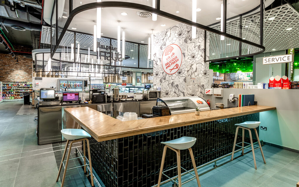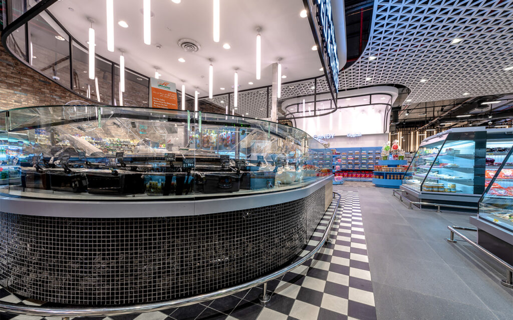 Всі холодильні та теплові меблі у супермаркеті розроблено відповідно з концепцією одного з провідних європейських дизайн-бюро.