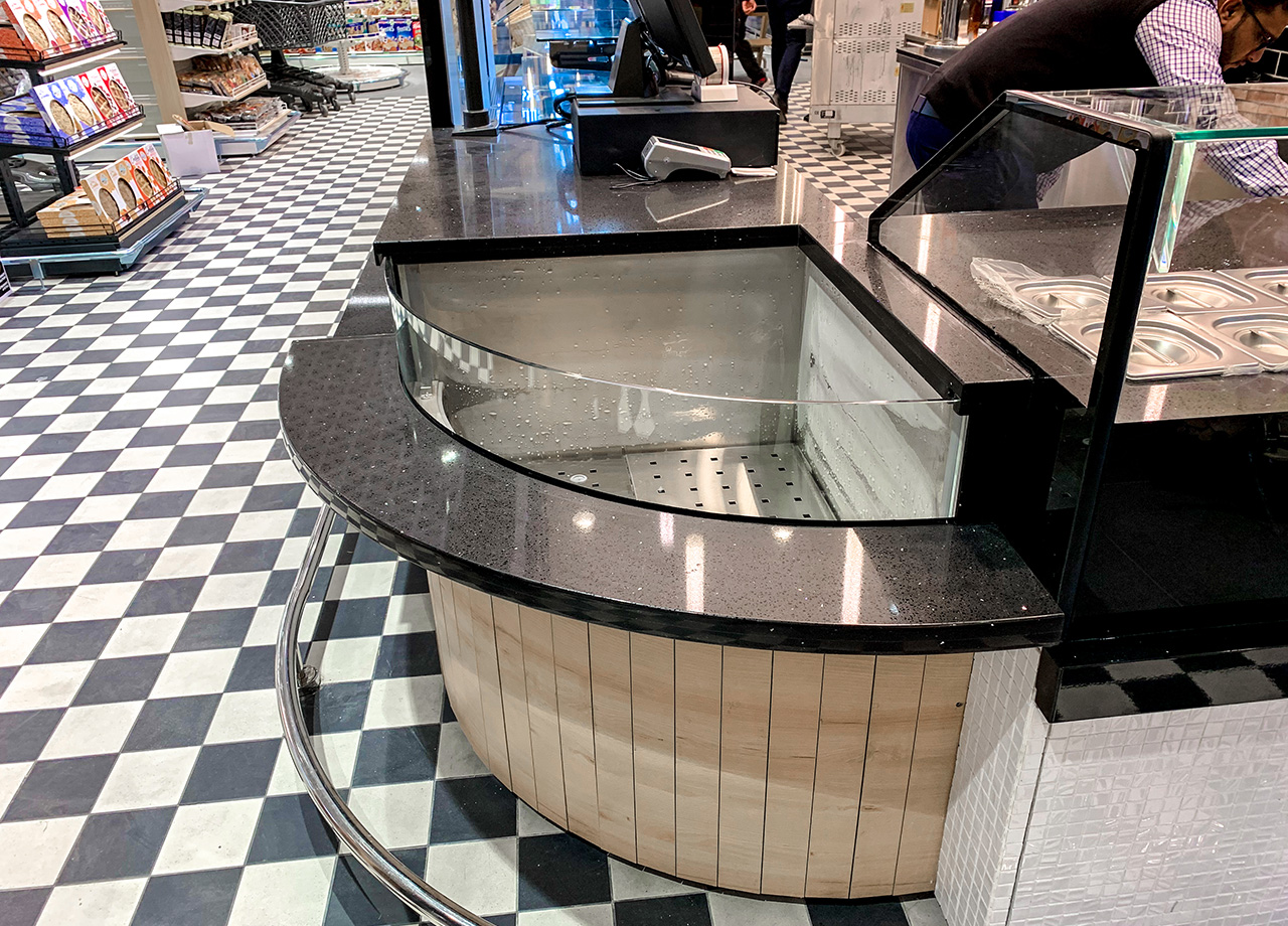 Sushi-бар c обробкою чорною керамічною плиткою і натуральним дубом оснащений вбудованими холодильними столами для зберігання інгредієнтів. Температурний режим +2/+4 °С.