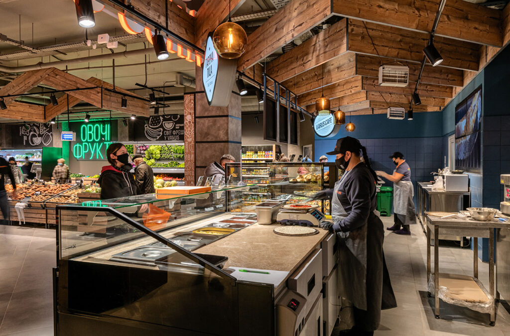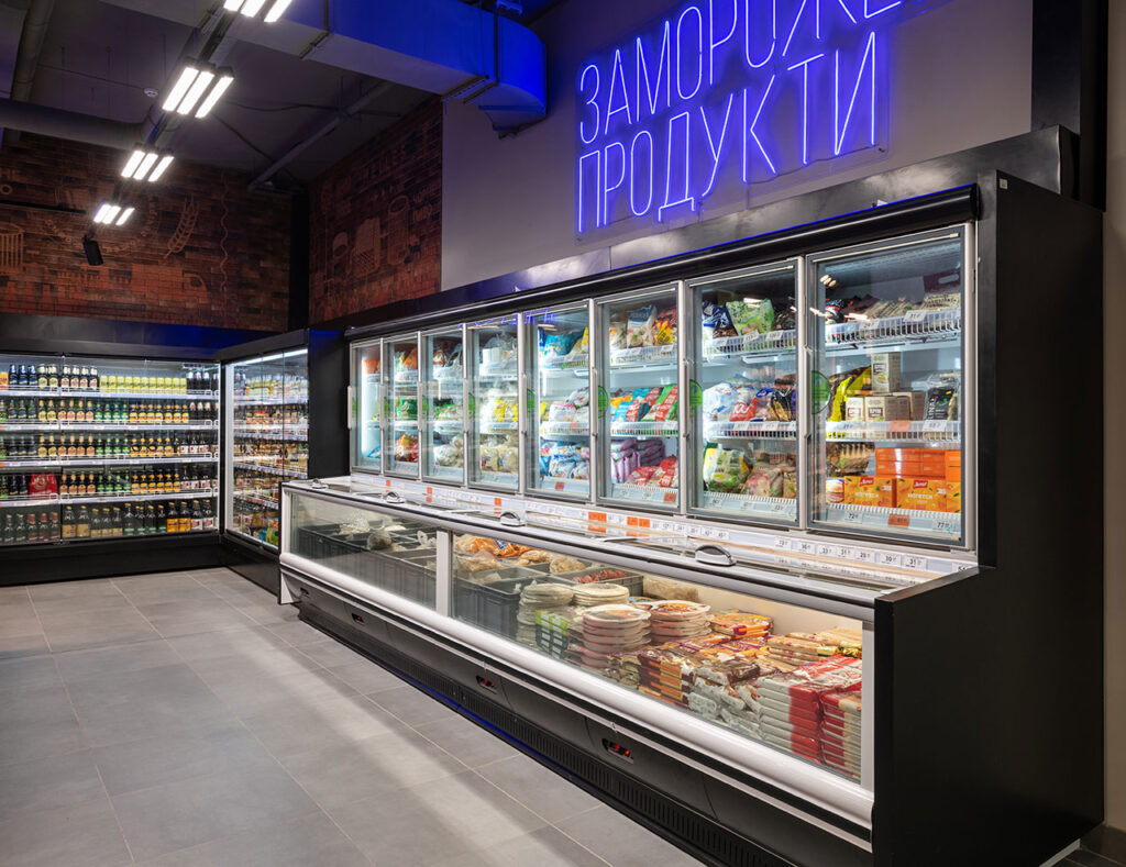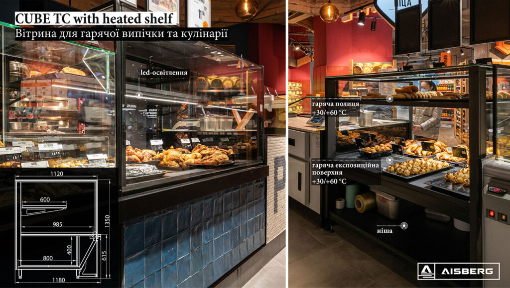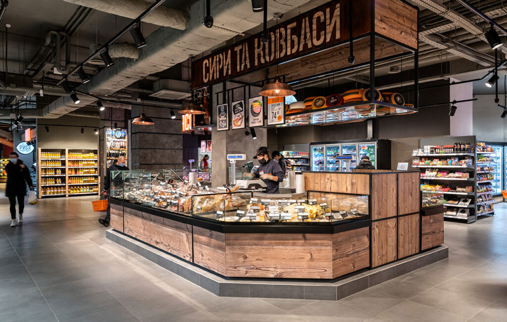 Гастрономічні острови організовані на базі лінії вітрин Cube з обробкою «під дерево». Холодильні вітрини для м’яса з обробкою «total black» мають панорамне фронтальне скло для максимально зручного огляду експозиції. Модуль довжиною 1250мм завдяки конструкції фронтального скла може легко трансформуватись у вітрину самообслуговування і навпаки – закриту вітрину для продажу вагових продуктів за допомогою продавця.