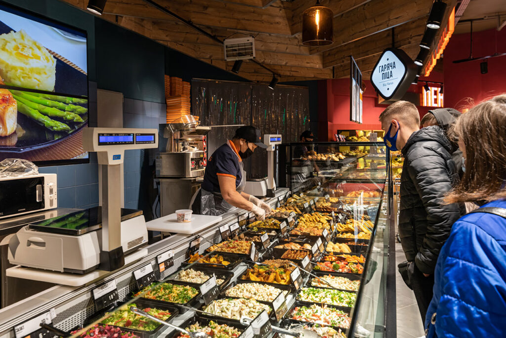 Холодильна вітрина Butterfly Cube оснащена подвійною повітряною завісою, що дозволяє економіти енергію. Вітрину встановлено в кулінарному відділі для продажу готових страв в режимі самообслуговування.