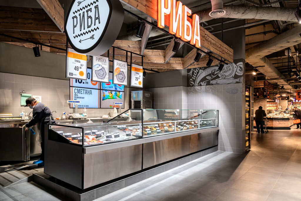 Інтер’єр рибного відділу оформлено в лаконічному сірому кольорі, в який надзвичайно гармонійно вписана лінія холодильних вітрин з нержавіючої сталі. Матеріал обробки – це не тільки санітарна вимога, але й висока якість, довговічність. Крім того, високоякісна сталь підвищує загальний рівень дизайну. В лінії поєднані два модулі з різними функціональними характеристиками: вітрина Fish для продажу риби на льоду з температурним режимом 0/+1 °С та низькотемпературна вітрина Cube BT.