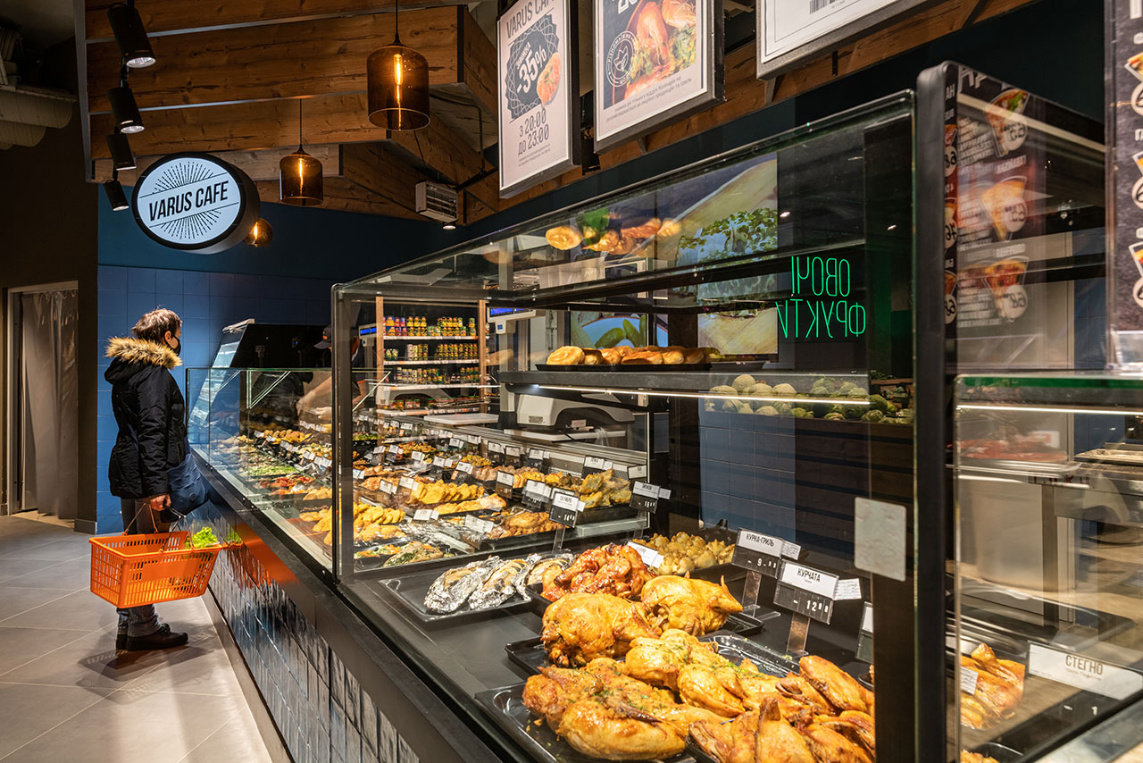 Відділ кулінарії під назвою Varus Cafe пропонує широкий асортимент холодних та гарячих готових страв, для ефективного продажу яких застосовано ряд нових технічних рішень. Основний асортимент Varus Cafe експонується в холодильних вітринах Cube SO з каскадною поверхнею та панорамним фронтальним склом. Лінію холодильних вітрин інженери Aisberg доповнили тепловим модулем висотою 1350мм з двома рівнями, що підігріваються. Температурний режим +30/+60 °С. Гаряча та холодні вітрини становлять єдину лінію з обробкою керамічною плиткою.