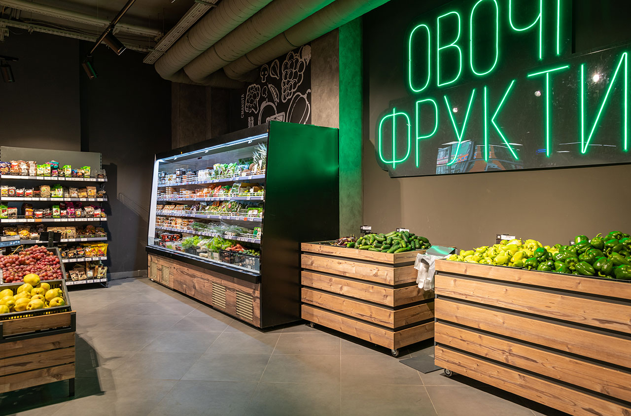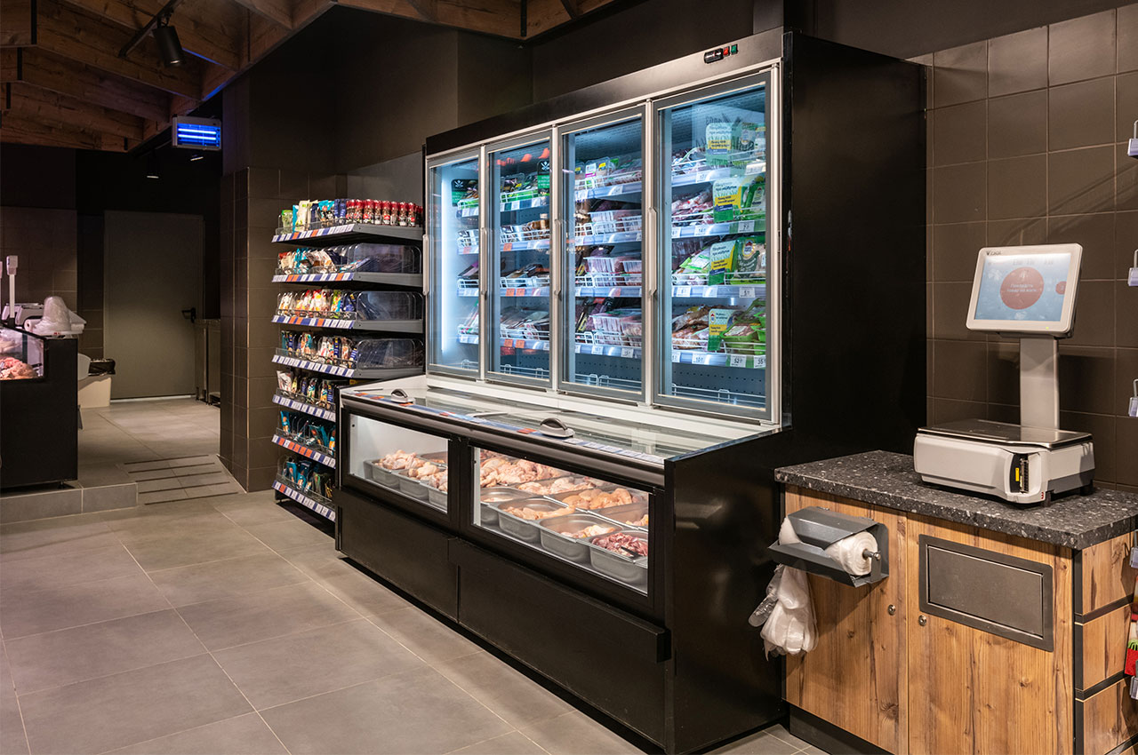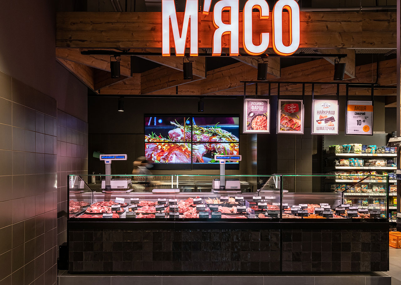Гастрономічні острови організовані на базі лінії вітрин Cube з обробкою «під дерево». Холодильні вітрини для м’яса з обробкою «total black» мають панорамне фронтальне скло для максимально зручного огляду експозиції. Модуль довжиною 1250мм завдяки конструкції фронтального скла може легко трансформуватись у вітрину самообслуговування і навпаки – закриту вітрину для продажу вагових продуктів за допомогою продавця.
