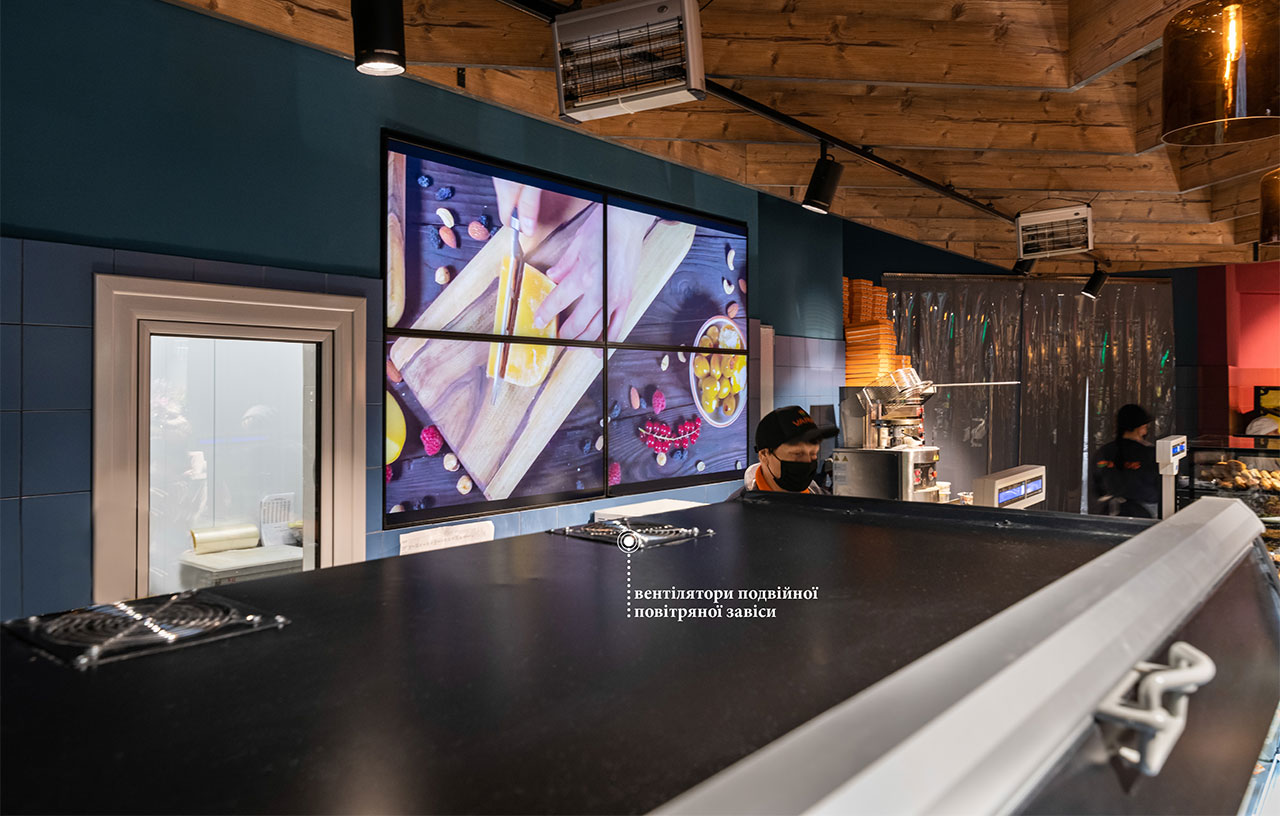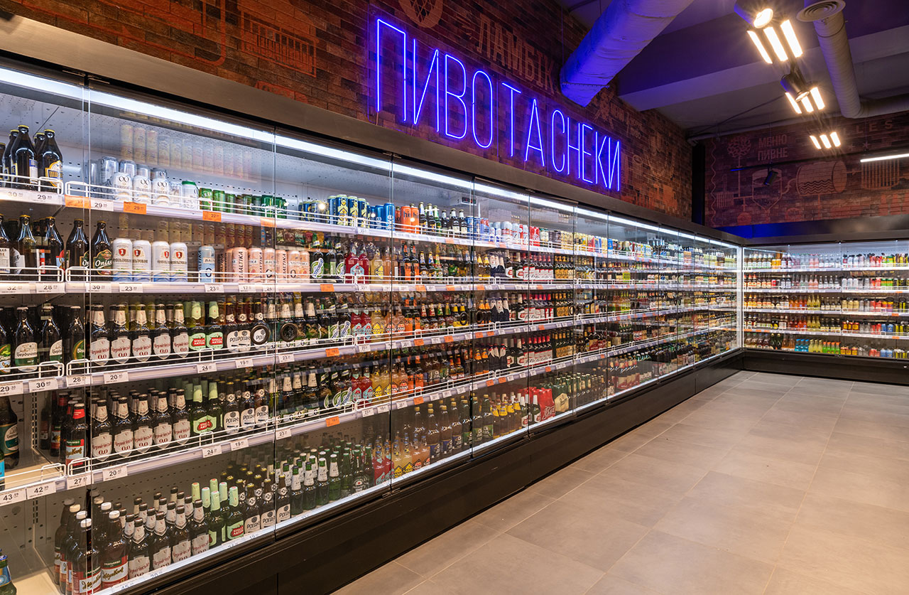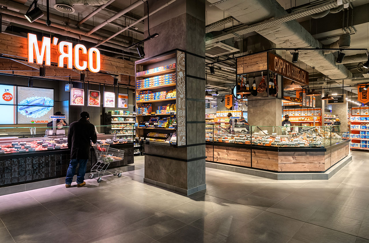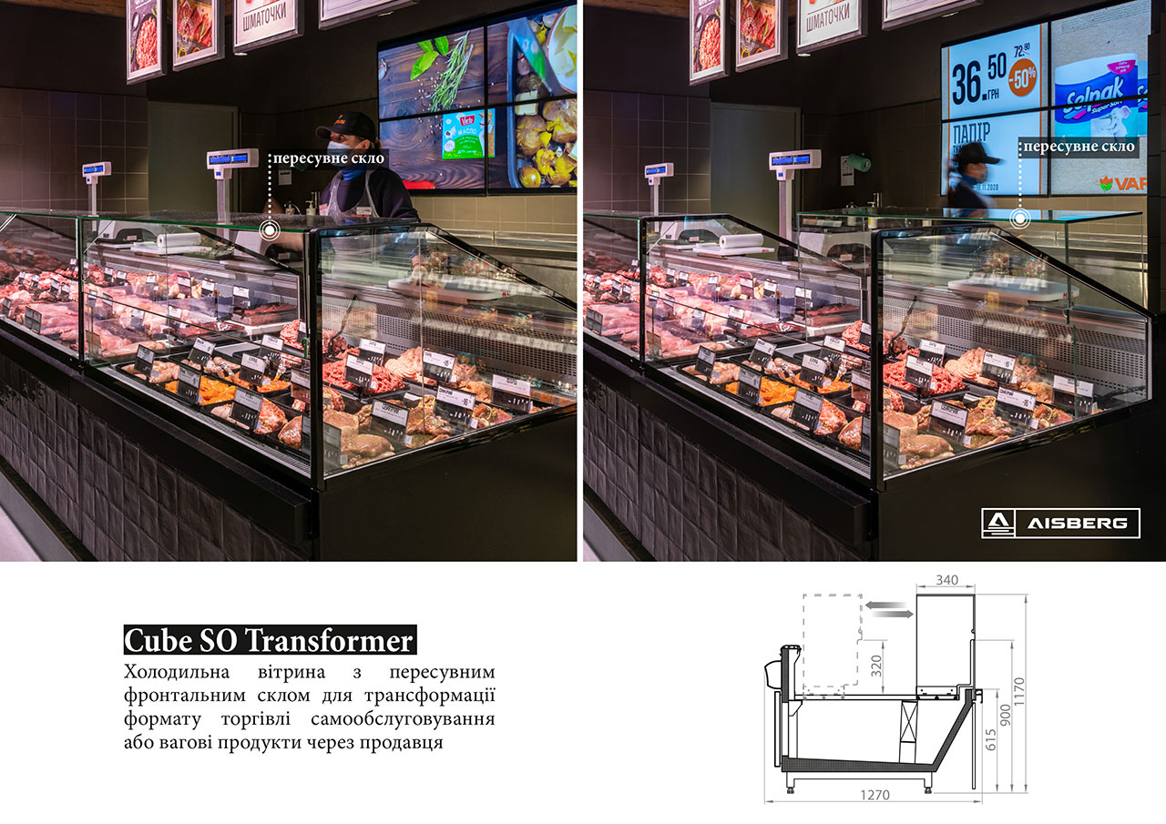 Гастрономічні острови організовані на базі лінії вітрин Cube з обробкою «під дерево». Холодильні вітрини для м’яса з обробкою «total black» мають панорамне фронтальне скло для максимально зручного огляду експозиції. Модуль довжиною 1250мм завдяки конструкції фронтального скла може легко трансформуватись у вітрину самообслуговування і навпаки – закриту вітрину для продажу вагових продуктів за допомогою продавця.