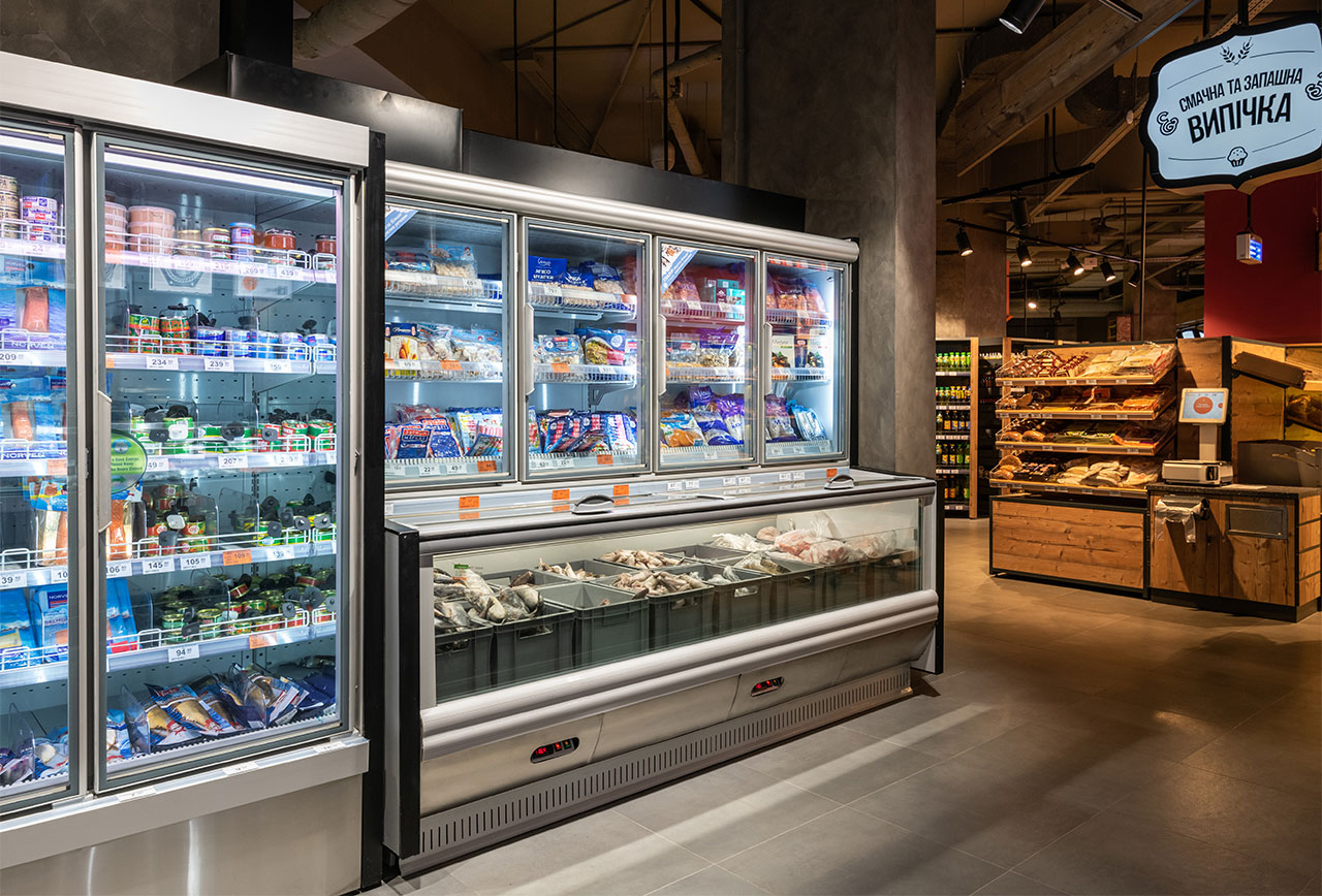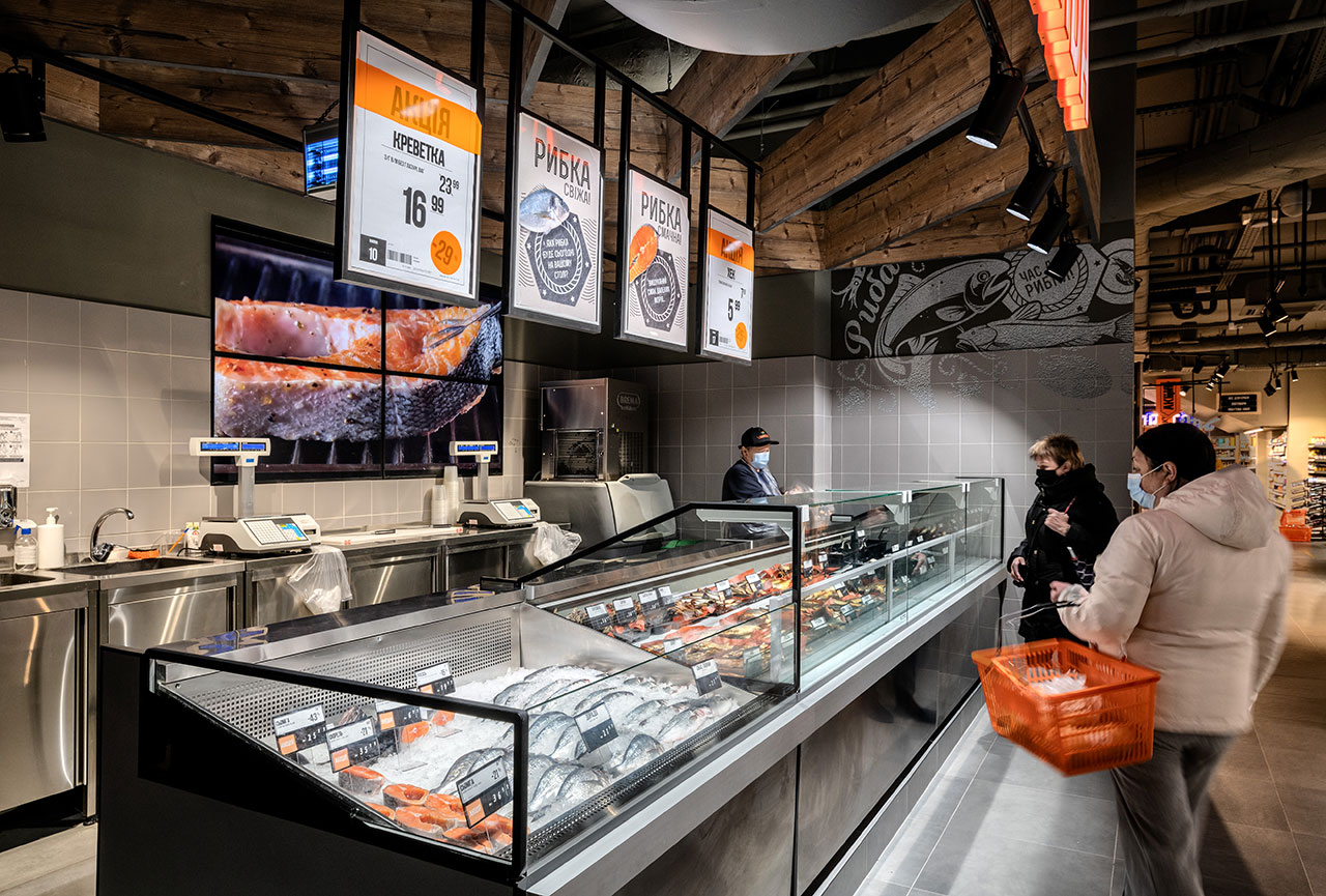 Інтер’єр рибного відділу оформлено в лаконічному сірому кольорі, в який надзвичайно гармонійно вписана лінія холодильних вітрин з нержавіючої сталі. Матеріал обробки – це не тільки санітарна вимога, але й висока якість, довговічність. Крім того, високоякісна сталь підвищує загальний рівень дизайну. В лінії поєднані два модулі з різними функціональними характеристиками: вітрина Fish для продажу риби на льоду з температурним режимом 0/+1 °С та низькотемпературна вітрина Cube BT.