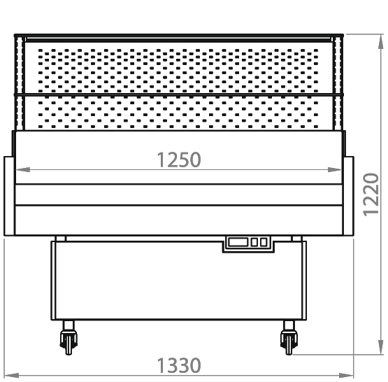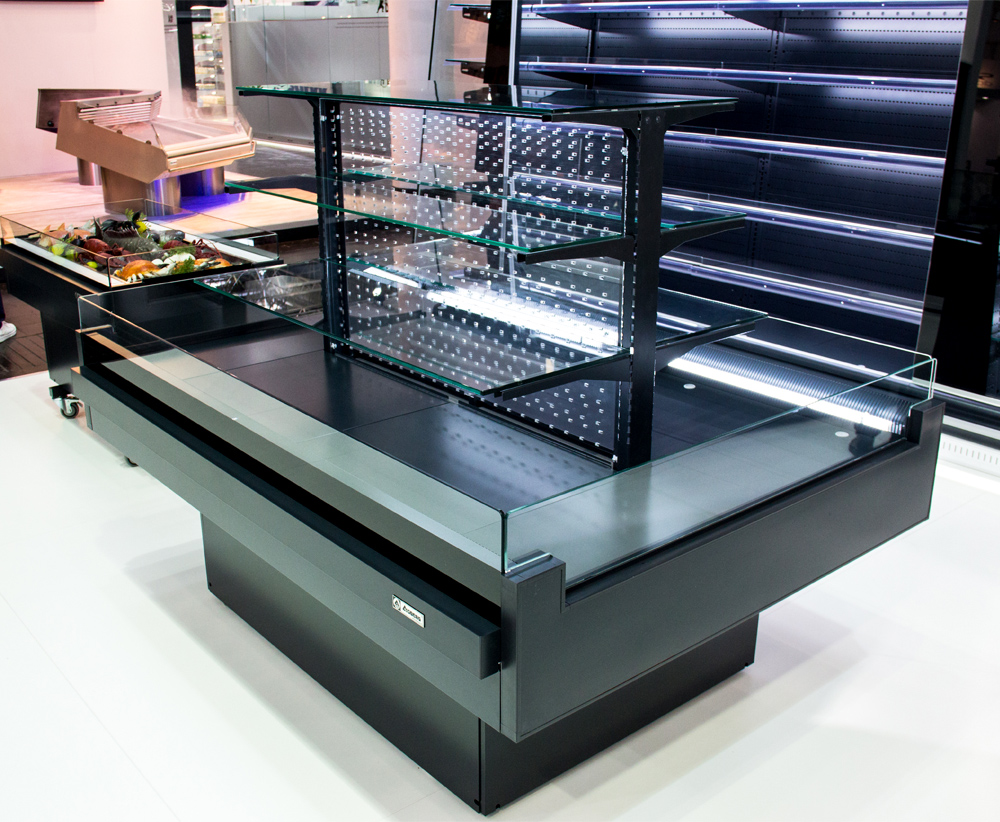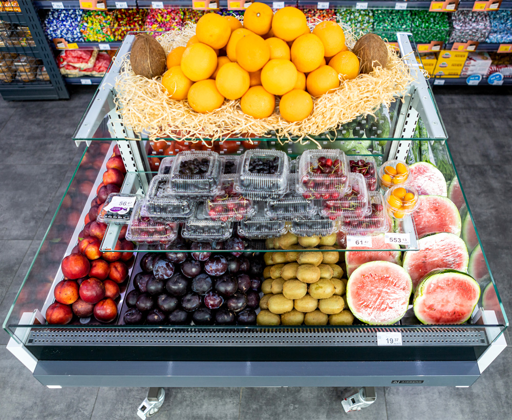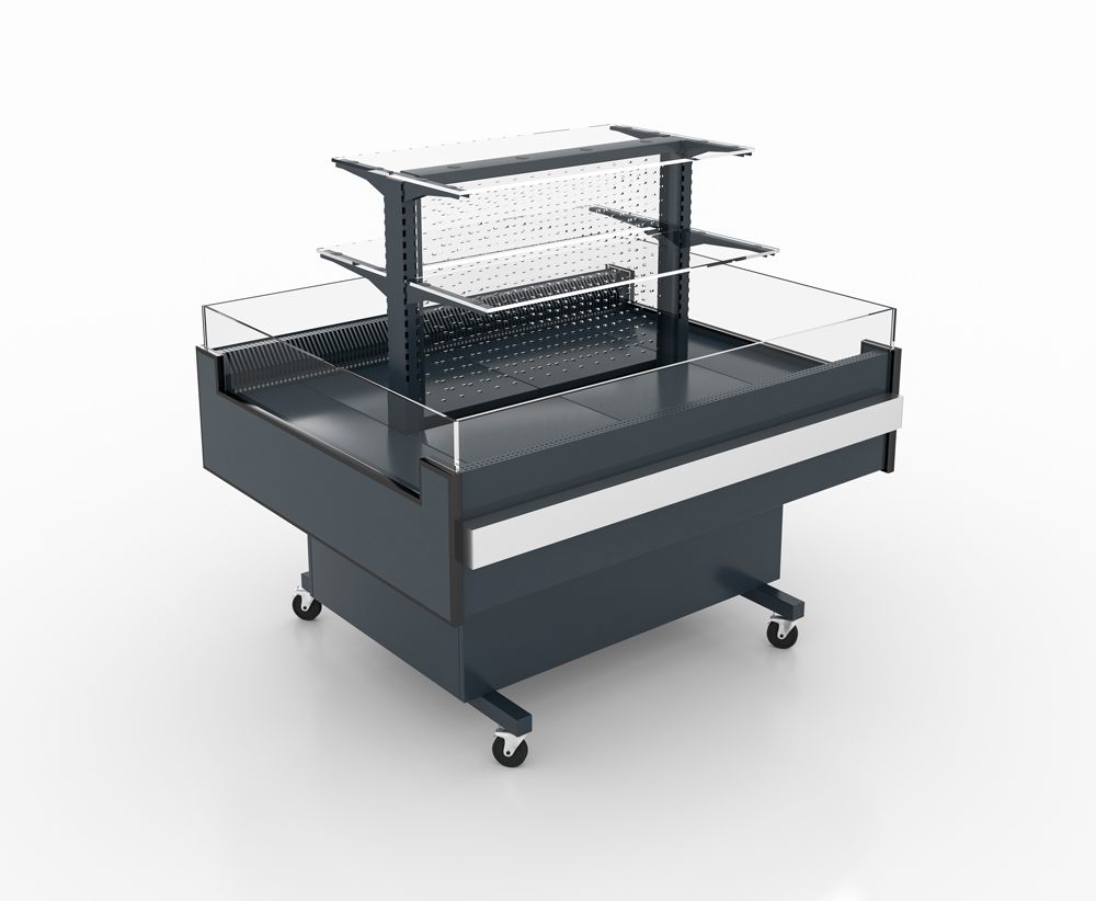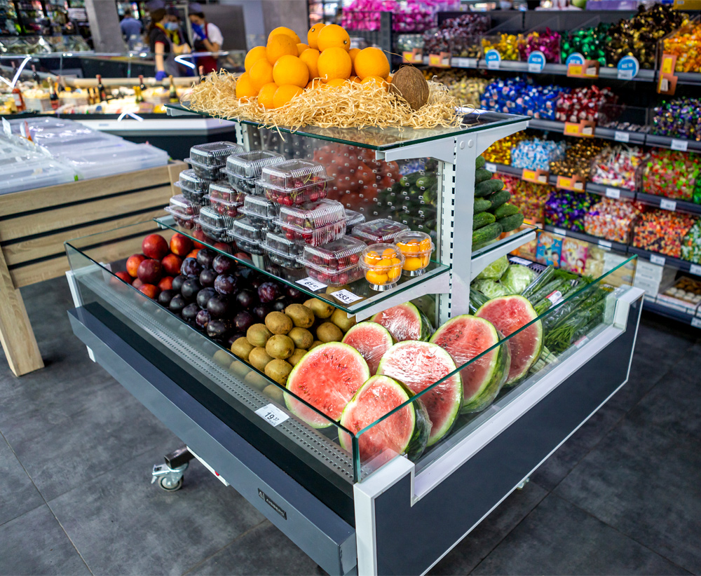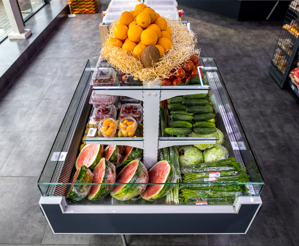Вітрина має три експозиційних рівня – два для продуктів, що потребують охолодження, і один без охолодження для додаткового асортименту. Це забезпечує максимально ефективне використання торгового простору. В конструкції вітрини передбачена охолоджувана повністю прозора полична суперструктура з освітленням.